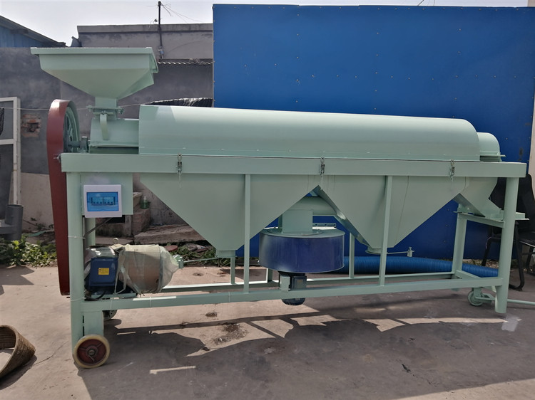 物料投放到進料斗后,打開電源,把風力調(diào)到適中,機器篩面做往復式運動,風機高速運轉(zhuǎn),打開下料插板,物料落到篩面上篩選,機器共有三層篩網(wǎng),一層篩選出來的是大于水稻的雜質(zhì),水稻和小于稻種的雜質(zhì)落二層篩網(wǎng)上,塵土小于水稻雜質(zhì)落到三層篩網(wǎng)上,各自從前端的出料篩出來,粉塵通過抽塵風箱抽出來。